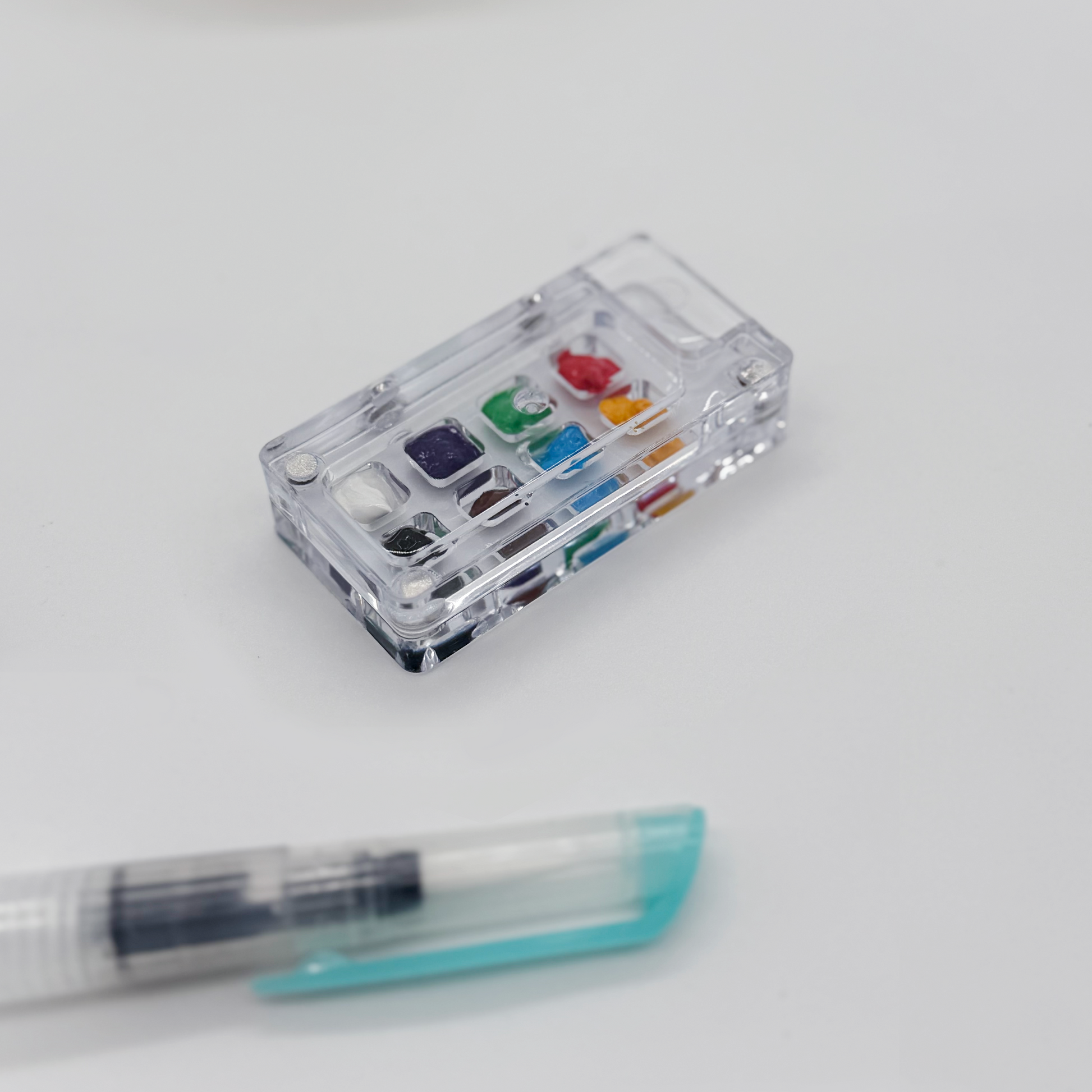 La paleta plegable transparente con 8 compartimentos se engancha a la libreta mediante la pinza incluida, permitiéndote trabajar cómodamente incluso al aire libre. Añade los 12 colores de pintura acrílica líquida incluidos en el set y empieza a crear sin necesidad de preparación adicional.